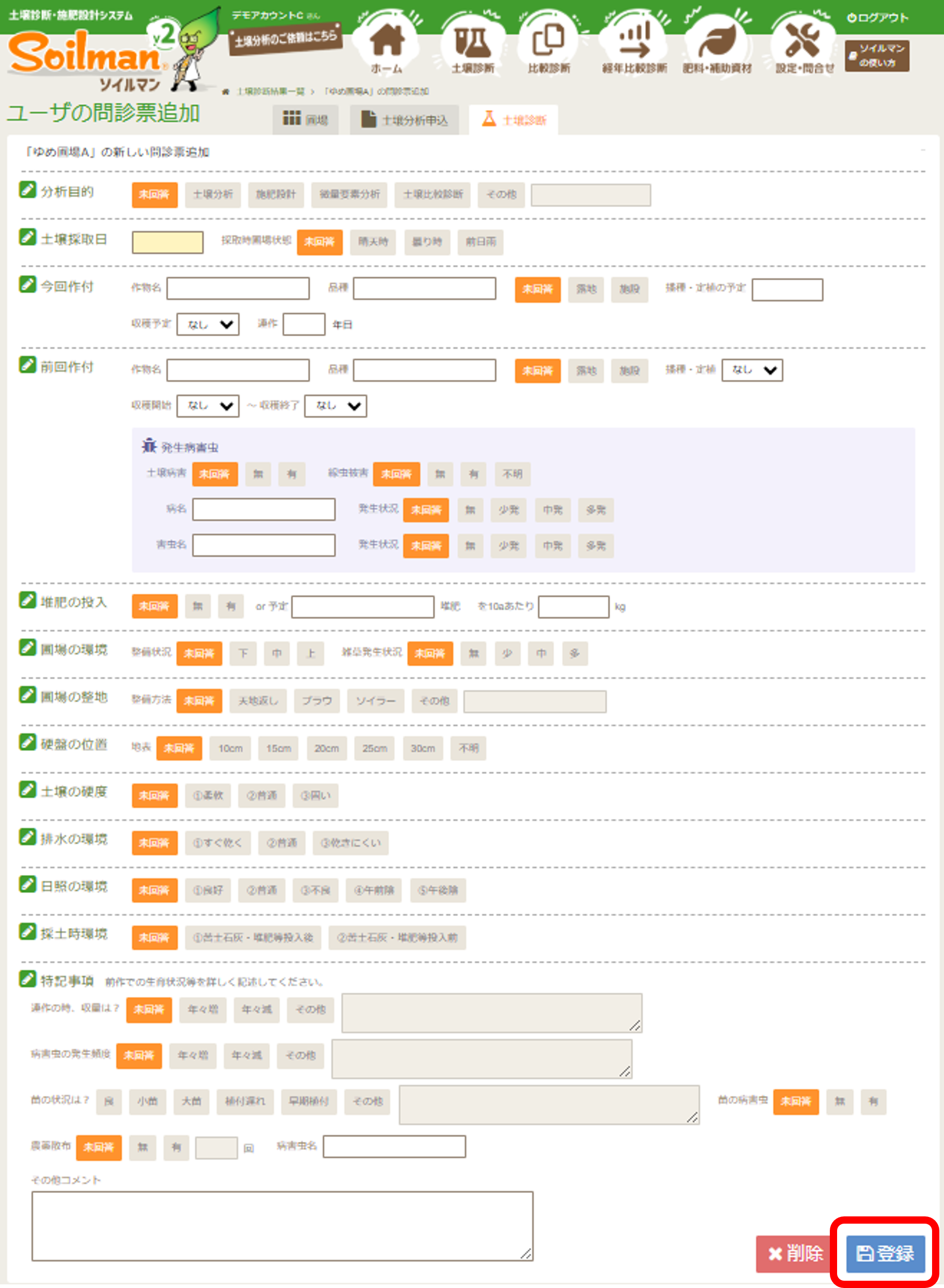確認・編集したい圃場の問診票の「編集」ボタンをクリックします。