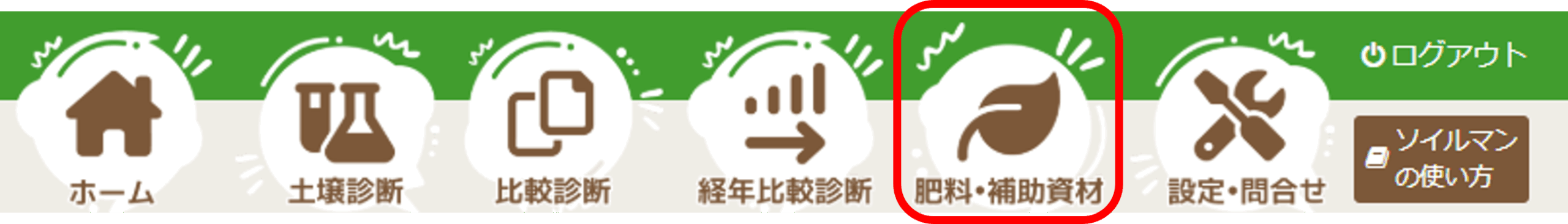 メインメニュー上部、右から2番目の葉っぱマーク「肥料・補助資材」をクリックします。
