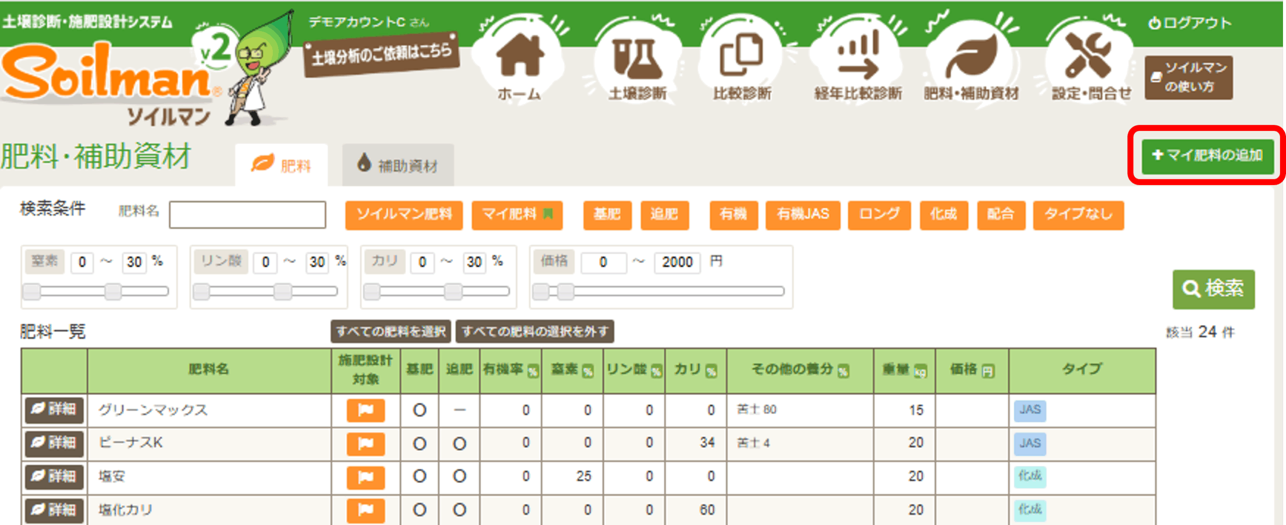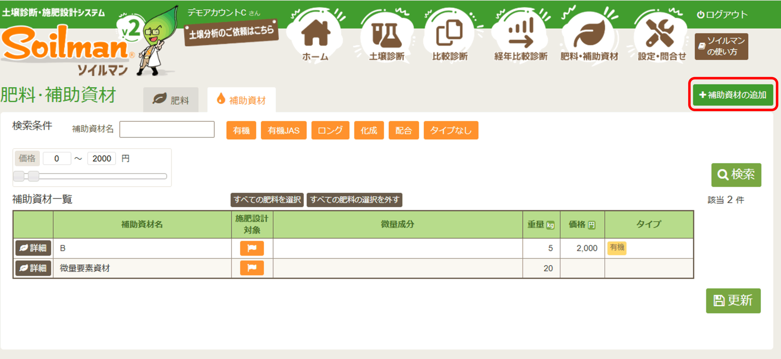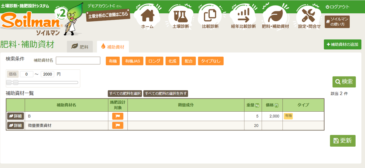 マイ肥料と同様に、補助資材も登録できます。