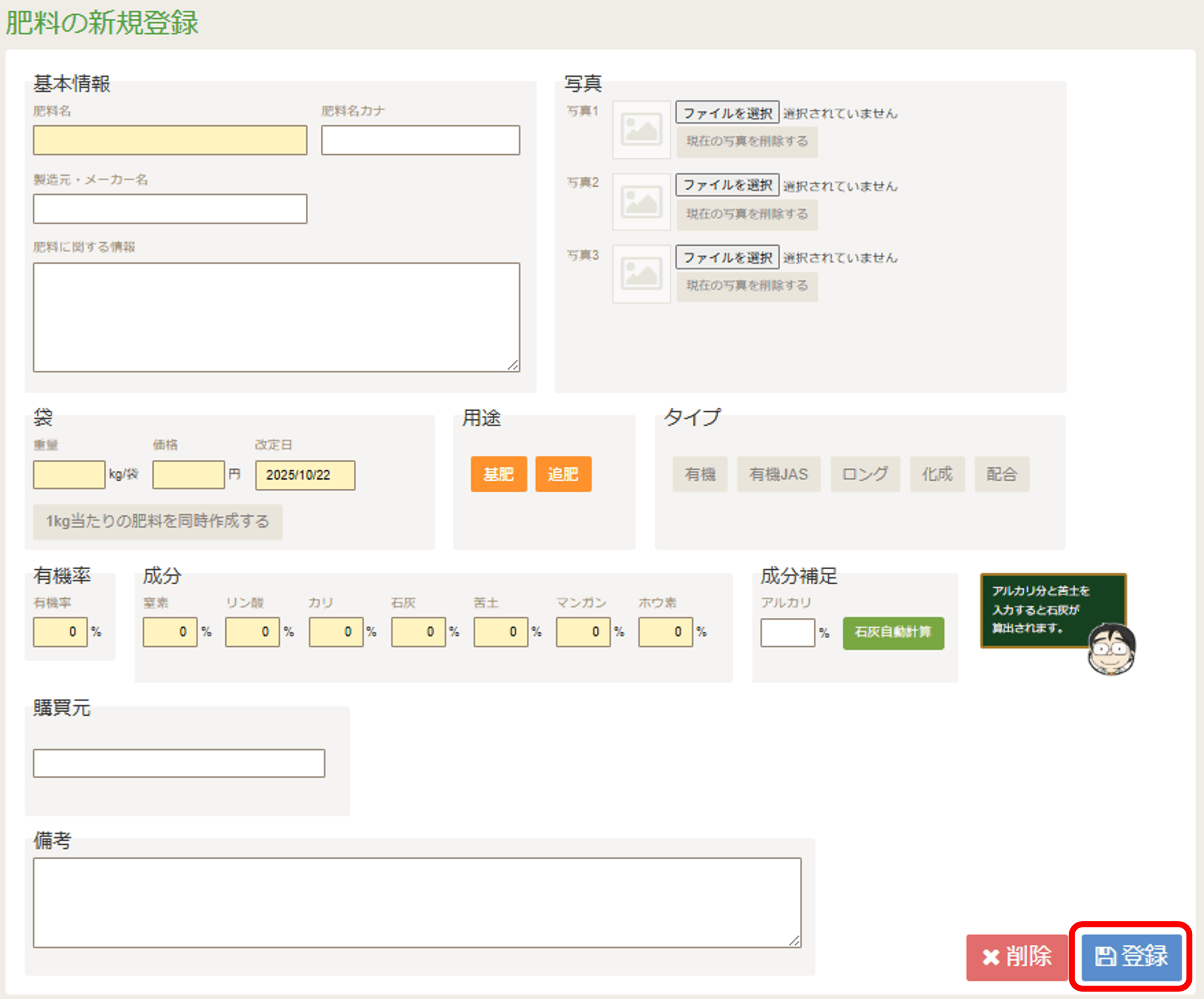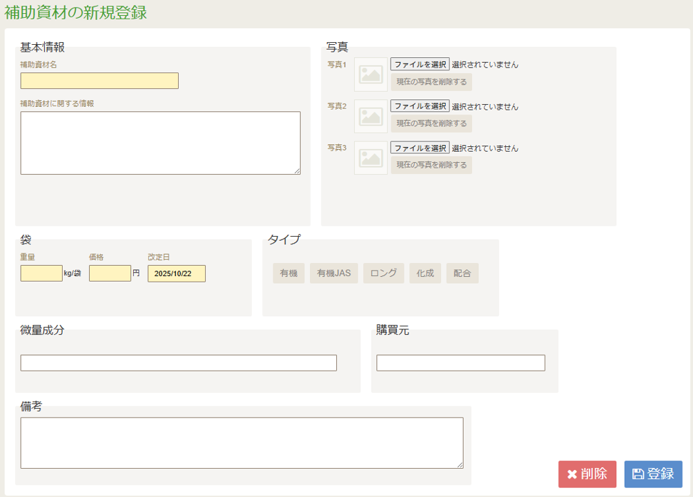 こちらは主に、ほう素や微量要素など、窒素・リン酸・カリ・石灰・苦土以外の資材を登録します。