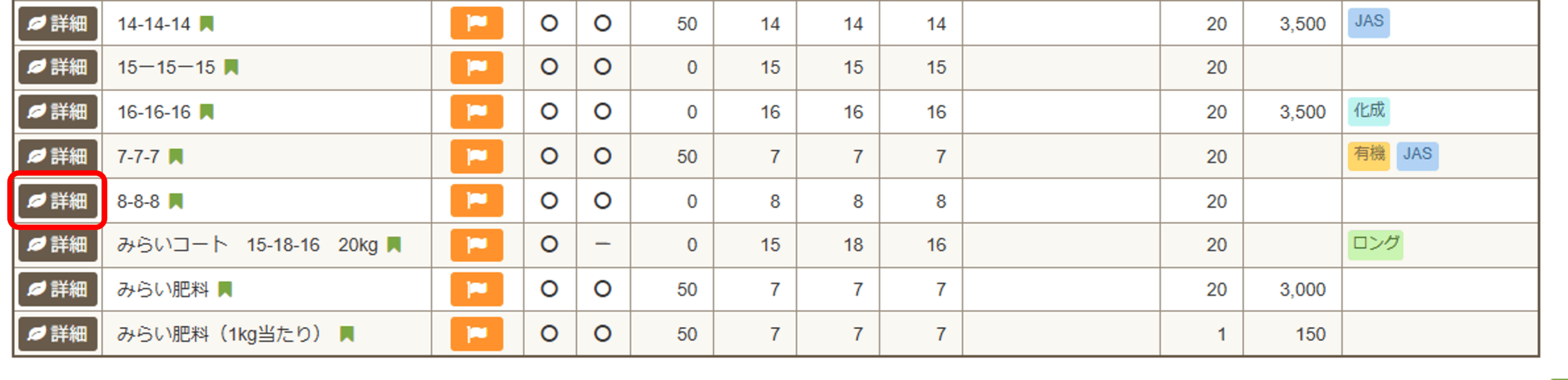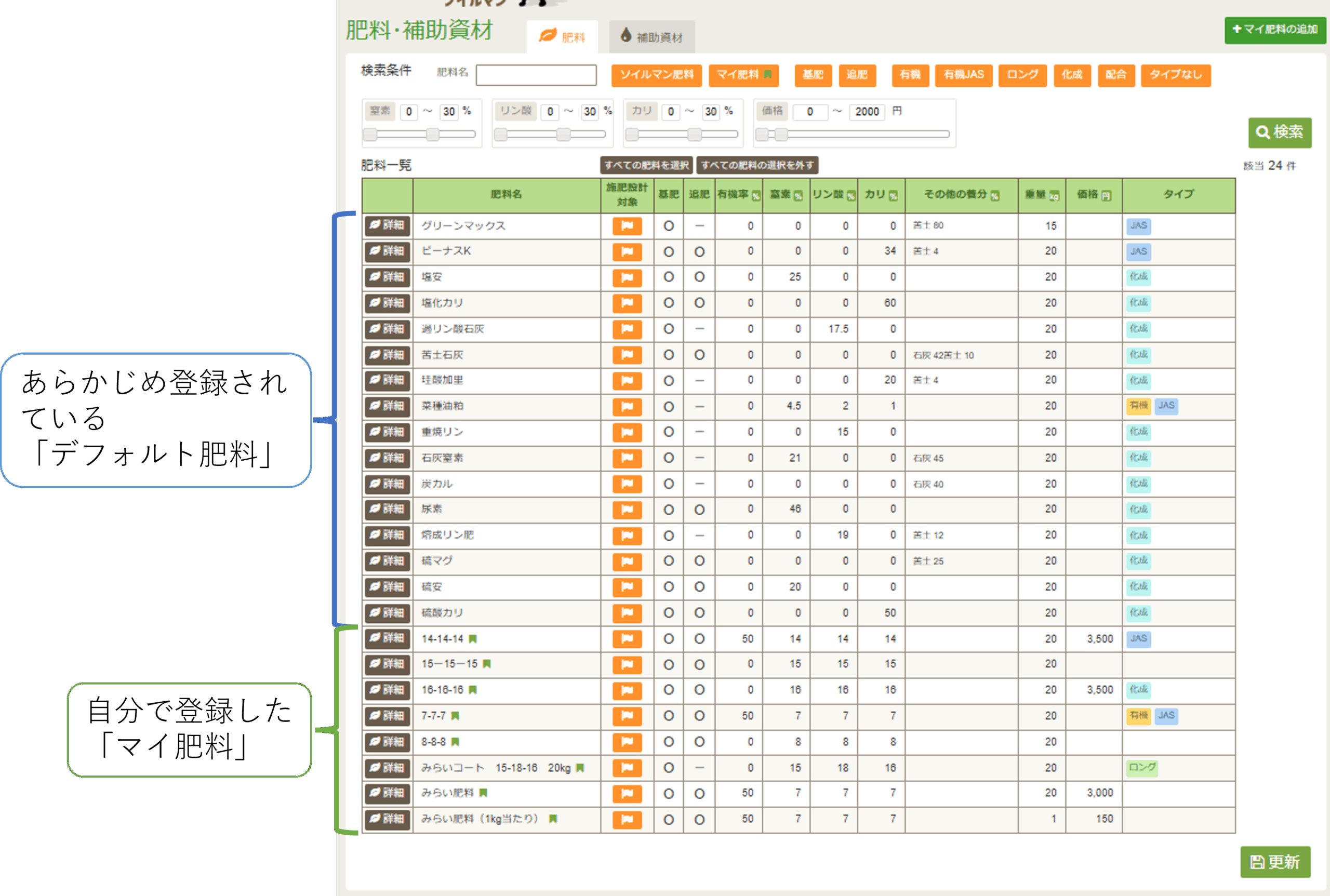 一覧の中で、緑の旗アイコンがついているものが「マイ肥料(自分で登録した肥料)」です。