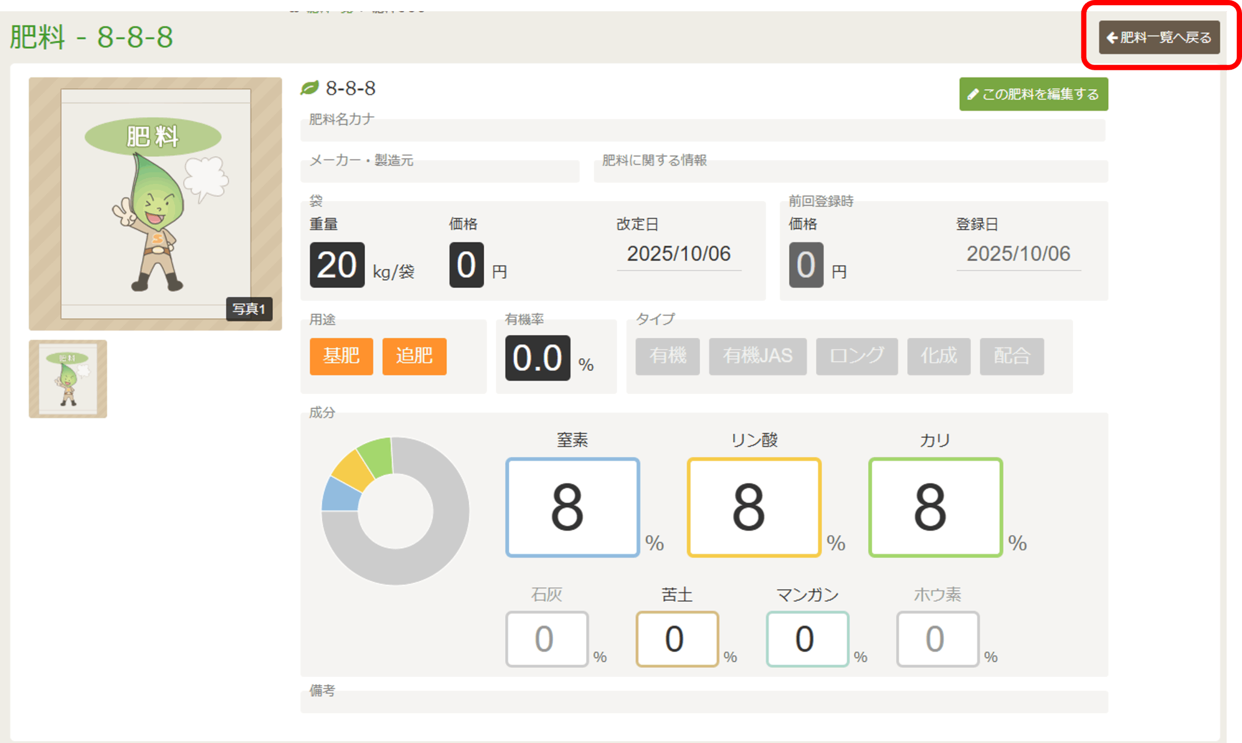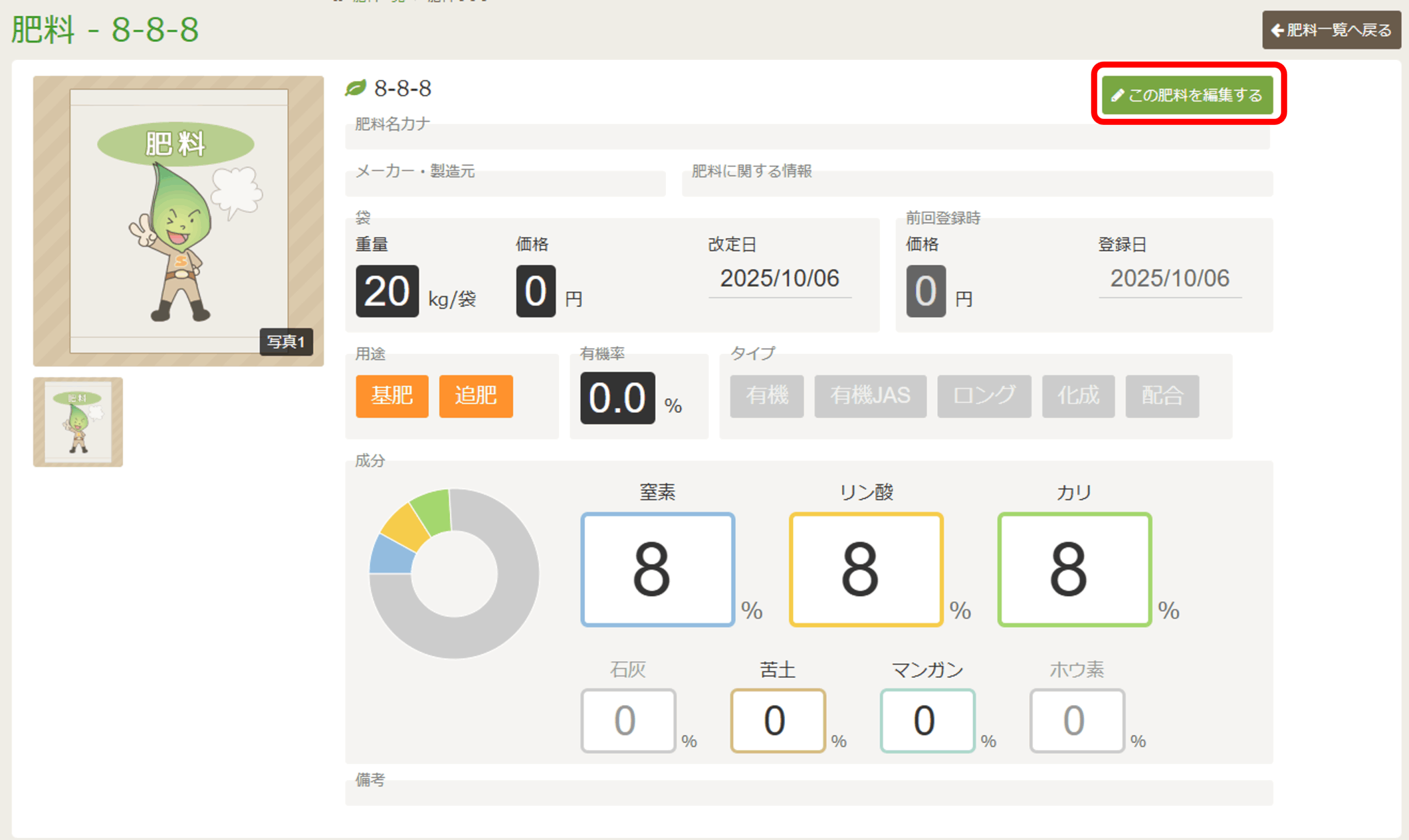 登録が完了すると、肥料の詳細画面が表示されます。