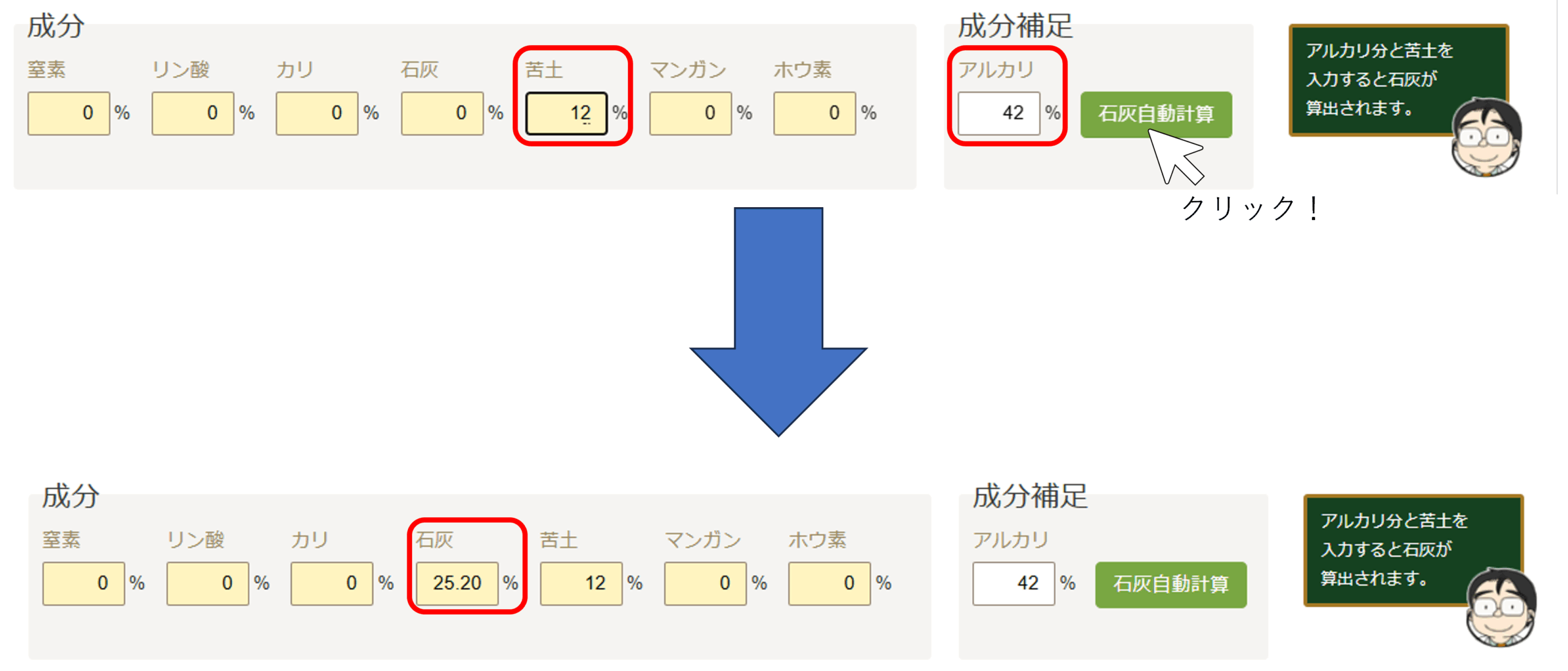 「アルカリ度」と「苦土」の成分を入力し、「石灰自動計算」ボタンをクリックすると、石灰量が自動計算されます。