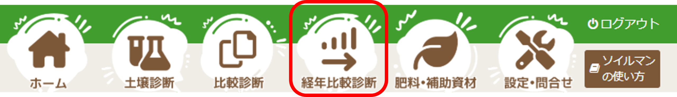 メインメニュー上部の丸アイコンから、右から3番目の「経年比較診断」をクリックします。