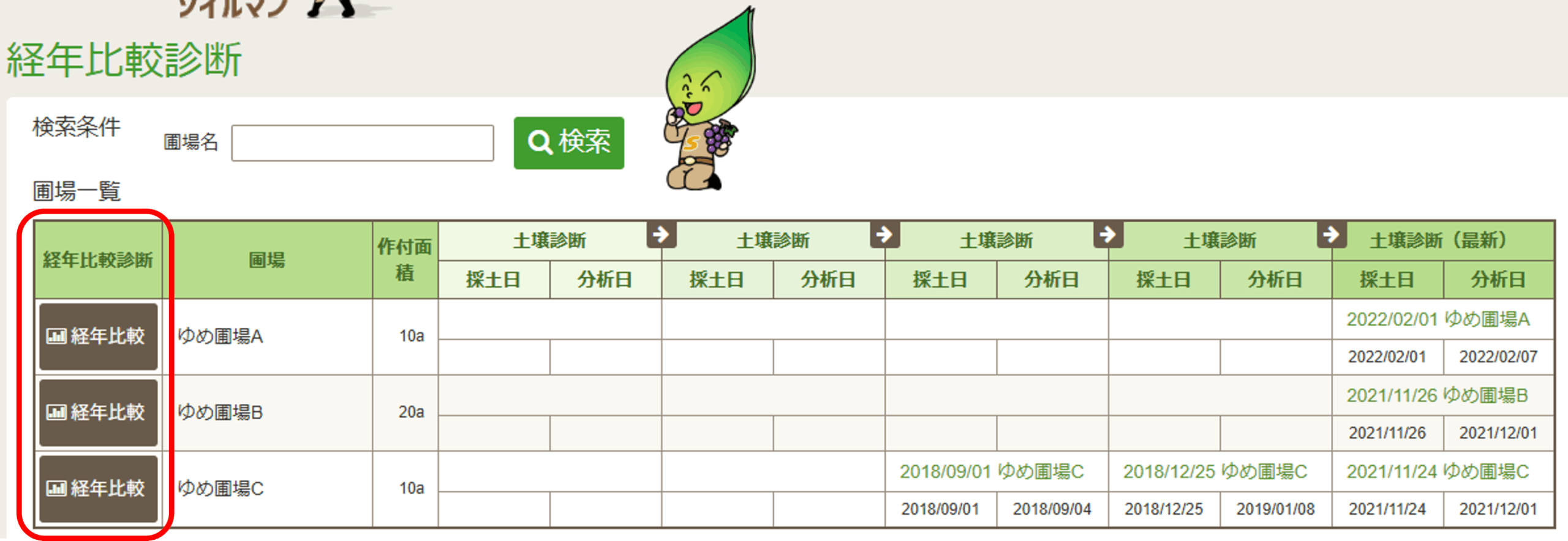 圃場一覧から、圃場名の左側にある「経年比較」ボタンをクリックします。