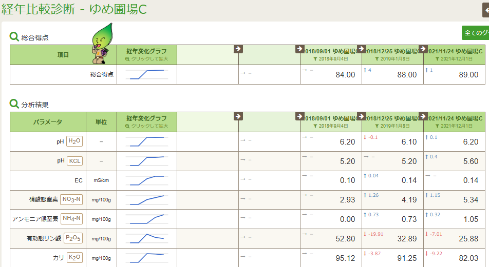 経年比較診断では、同じ圃場の過去5回分までの分析結果を並べて比較できます。