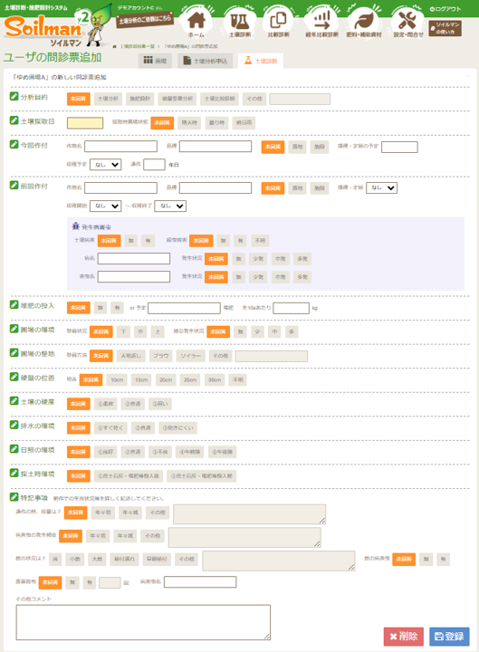 ※土壌分析申込時に「続けて問診票を登録する」をオレンジ色にした場合、こちらの画面に自動的に移動します。